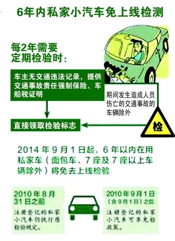 本报9月1日讯(记者 唐菁) 9月1日起,注册登记6年以内的私家车免于上线检测新规试行,凡是符合条件的车辆,凭相关证明到检测站领取检验标志即可,无需进行上线检测。