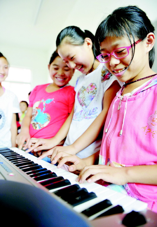 在郓城县南城初级中学,很少上音乐课的孩子们对电子琴产生浓厚兴趣。本报记者 王媛 摄