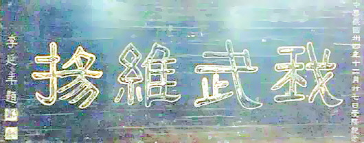 受降仪式结束后,李延年亲笔书写了“我武维扬”四个大字,后来被制成木质匾额,一直保存在“奎虚书藏”楼里。该匾长2.75米,宽1.11米,重约300斤。“我武维扬”四个金色大字遒劲有力,上面还写有“中华民国卅四年十二月廿七日受降纪念”字样,落款为“李延年题”。