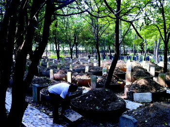 最近一段时间,陵园正在施工。杨智忠将一个歪倒的墓碑小心地扶起来。
