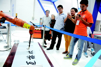 在众人的围观中,一台黄色的机器人用手臂轻握毛笔,在特制的白纸上挥毫泼墨,横竖撇捺,还会转笔蘸水,不用几分钟的时间,几个工整的大字便在白纸上呈现,引来围观者一片叫好。