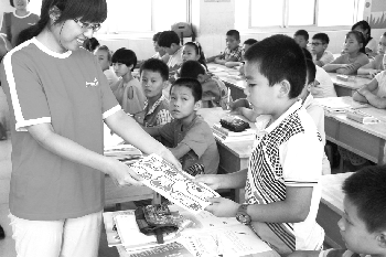 安利志愿者为鼎舜小学学生送环保小礼物。本报记者 李军 摄