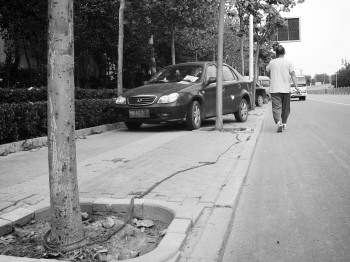 9月2日,在东方红路岔河西侧的路边,8月28日由城管工作人员拉起的防止汽车乱停的红绳已被扯断,车辆重新占满人行道。 本报记者 马志勇 摄