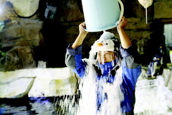 8月31日,青岛海昌极地海洋世界的一名员工正在接受冰桶挑战。