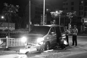 商务车撞倒护栏,车头面目全非。 本报见习记者 隋忠伟 摄