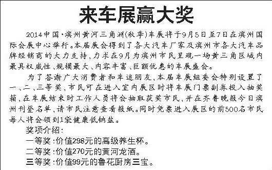 为了答谢广大消费者和车迷朋友,本届车展组委会特别设置了一、二、三等奖,市民可在进入室内展区时将车展门票副券投入抽奖箱,在车展结束时工作人员将会抽取获奖市民,并在齐鲁晚报今日滨州刊登名单,请市民注意查看报纸。同时凭票进入展区的前500名市民每人将会领到1袋健康低钠盐。