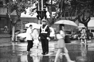 2日,在市区统一路和光明路路口,交警一大队民警冒雨在路口执勤。