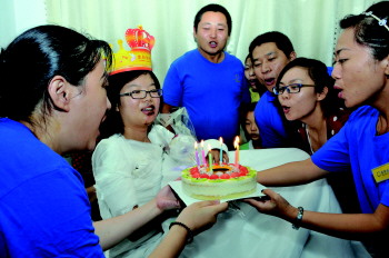 9月2日,烫伤女孩韩韩(左二)在家人、爱心人士及医护人员的陪伴下度过了19岁生日。在本报报道了韩韩因帮父母做家务被烫成重伤的消息后,不少爱心人士向她伸出了援手,目前韩韩恢复良好,但高昂的治疗费依然是个难题,希望有更多市民能帮韩韩渡过难关。