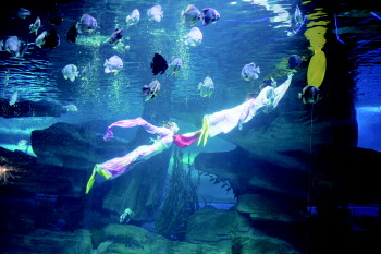 伴随着优美梦幻的乐曲,水下剧场升起一枚明亮圆润的满月,远远看来,颇有“海底升明月,天涯共此时”的意境。湛蓝海水中,一尾尾黄金鲹、燕子鳐、豹纹鲨等海洋鱼类从温和的月光中穿行,显得格外静谧美好。身姿曼妙的“嫦娥”舞动着长长的披肩纱带,在乳白色“月光”的映衬下翩然降临,将这个家喻户晓的美丽传说精彩呈现。精彩的水下舞步后,“嫦娥”向着上空悬浮的“明月”飞升而去。浪漫唯美的巧妙创意,将传统故事与水下舞蹈艺术有机结合打造的这场经典的“嫦娥奔月”节目,将在“中秋小长假”期间轮番上演。