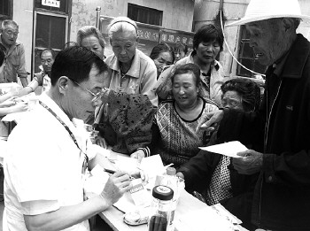 3日早上8点多,载着专家和便携式心电图仪、B超机的大巴车,抵达泗水县泗张镇政府驻地。当地村民也早早赶来,在院子里围坐了几圈。由内科、骨科、眼科、妇科、儿科等专家组成的义诊团刚坐下,就不断有村民问诊。