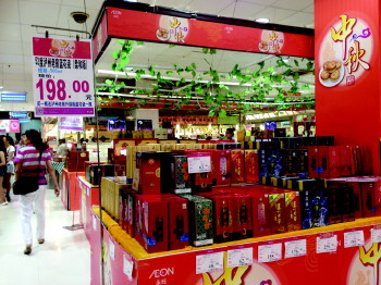 中秋节即将到来,为抢占岛城市场“高地”,高中低档白酒齐促销。高端白酒中茅台、五粮液等领衔降价,价格相比往年下降两到三成,但其销量仍下降了五成左右;二三线品牌白酒则推出买一送一、购酒返券等各种各样的促销方式,受到消费者的青睐,成为拉动超市、商场业绩的主力军。