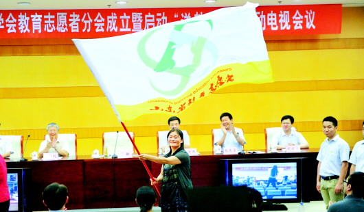 5日下午,山东省教师教育学会和本报共同发起成立教育志愿者分会,并启动“送教下乡”活动,1400名教育志愿者奔赴菏泽等地支教。图为志愿者代表(中)接受省教育厅厅长左敏授旗。       本报记者 王媛 摄
