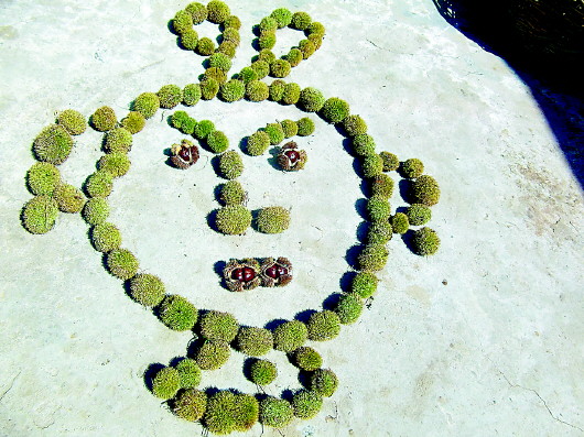 济南周边盛产板栗,济南的板栗久负盛名。这是济南南部山区果农家里用板栗摆成的一幅图画——板栗丰收,人在笑,板栗也在笑。