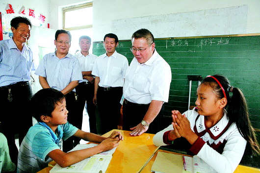 ▲孙秀江副书记在东山腰小学关切地询问孩子们对新课桌是否满意。
