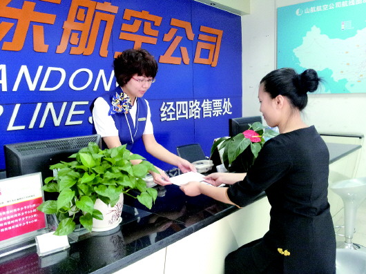 山航营销委济南营业部售票处的员工在给顾客办理机票。