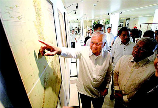 ◥11日,菲律宾外长在地图展开幕式上向参观者展示地图。