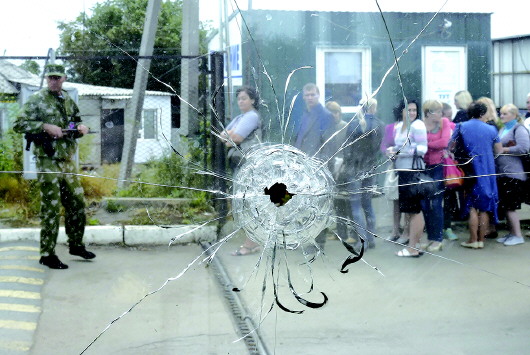 12日,在乌克兰东部一边检站,人们在有弹孔的玻璃后面排队等候过境前往俄罗斯。 新华/法新
