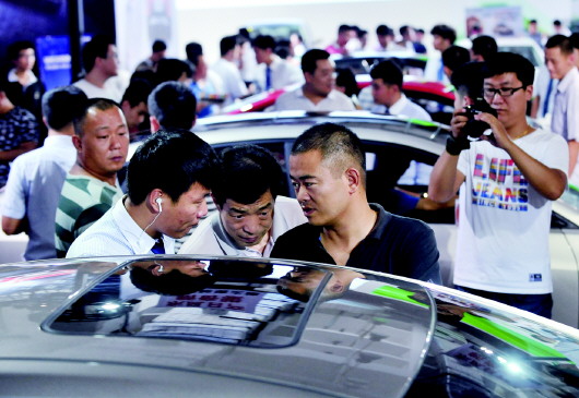 ▲车展人头攒动,三位车迷正在讨论价格。