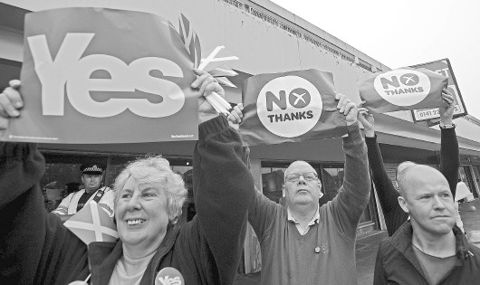 9月12日,在英国苏格兰格拉斯哥,支持和反对苏格兰独立的民众相争不下。新华/法新