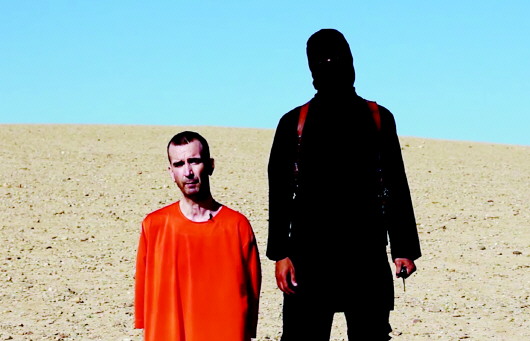 由“伊斯兰国”发布在互联网并由反恐监控机构9月13日确认的视频的截图显示,在一处沙漠地形中,一名戴面罩的武装分子与身穿橘色衣服下跪的人质戴维·海恩斯在镜头前。 新华/美联