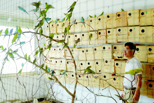 在孟凡佳的观光鸟养殖场里,颜色不同、形态各异的万只鹦鹉、文鸟、玉鸟上下跳跃,叫声嘹亮,宛如鸟的王国。“这是我的第一个鸟场,养鸟要有一套完善的管理制度,并了解鸟的习性,一天得换三遍空气,养鸟的房子贴绿纸的是孵小鸟蛋的、贴红纸的是孵小鸟的、贴黑纸的是箱子需要消毒了……”说起养鸟经,孟凡佳如数家珍。