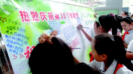 而教师节的早上,学校校园里,竖立了一面“祝福墙”,上面写着:浓浓尊师意,款款爱生情,热烈庆祝第30个教师节。这面教师节“祝福墙”吸引了不少学生的注意,孩子们纷纷拿起彩笔在这面墙上写下自己对老师的真心祝福话。“亲爱的刘老师,一根根银丝已悄悄爬上您的双鬓,一堂堂精彩的语文课,一次次精心批改的作业,都让我对您崇拜不已,刘老师我爱您!”“加减乘除,算不尽您做出的奉献!诗词歌赋,送不完对您的崇敬!您用知识甘露,浇灌我们理想的花朵;您用心灵清泉,润育我们情操的美果。在这不寻常的节日里,祝您教师节快乐!”