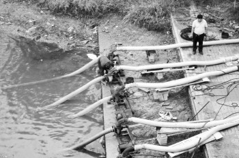 9月14日,在岔河岸边,长河公园补水作业的工作人员冒雨对抽水设备进行维护。 本报记者 马志勇 摄