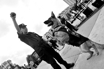活动开始后,武警日照支队还演示了特种战术和格斗术,市公安局特警支队进行了警犬车内搜爆演练。虽然活动途中下起雨,但市民们冒雨观看,掌声不断,纷纷用手机拍照。