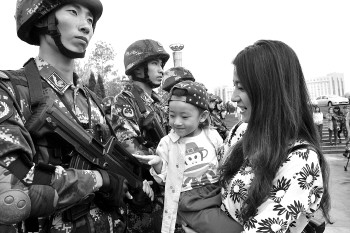 一位小朋友对武警战士胸前的钢枪很感兴趣。 本报记者 刘涛 摄
