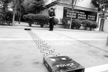 演示中,特警队员按下手中的遥控器,阻车器内的尖锐的管状钉子随着伸缩器布满了道路。“这个阻车器主要针对驾车逃窜的犯罪分子。”特警队员说,管状钉子能扎碎轮胎,使车辆无法继续行驶。