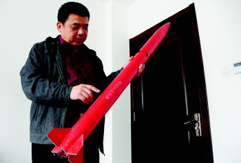 ◤市气象局工作人员介绍增雨防雹火箭。(资料片)