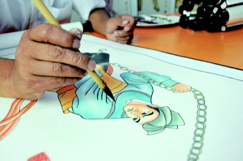 画底稿仅是第一步,也是最煎熬的一步,《水浒传》里人物的形象要在脑海里翻来覆去的琢磨半天,如果拿不准了,张云茂就翻出《水浒传》,把提到那个人物的章节再读一遍,在脑中不断调整着人物的形象。底稿完成后,再用宣纸勾画出来,然后用颜料上色,张云茂常常一画就是半天,有时都忘了吃饭,一周时间才能完成一幅。