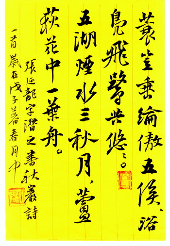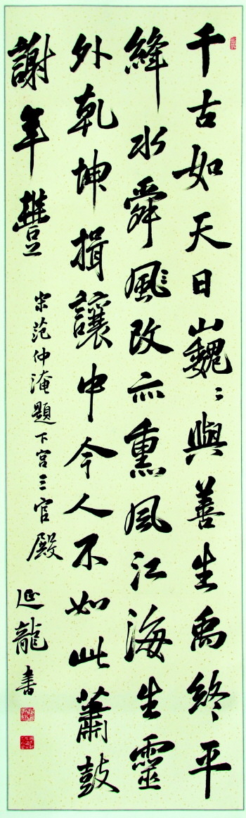 张延龙,字潜之,号长山布衣。山东省邹平县人。1957年生。自幼酷爱书法艺术,拜山东省文史馆员宋勉之、郭连贻二位先生为师,以二王为宗,旁涉唐、宋、元、明、清诸大家,遍临古帖,兼习国画、篆刻,暇中填调词、赋诗、作文。2002年获中国首届书法兰亭奖最高奖(创作奖),2005年获山东省书法特别贡献奖。十几年来共获全国各类书法大奖十余次。凡获奖入选作品皆以自作诗词文赋而应制。追求文德双修,技艺共进。