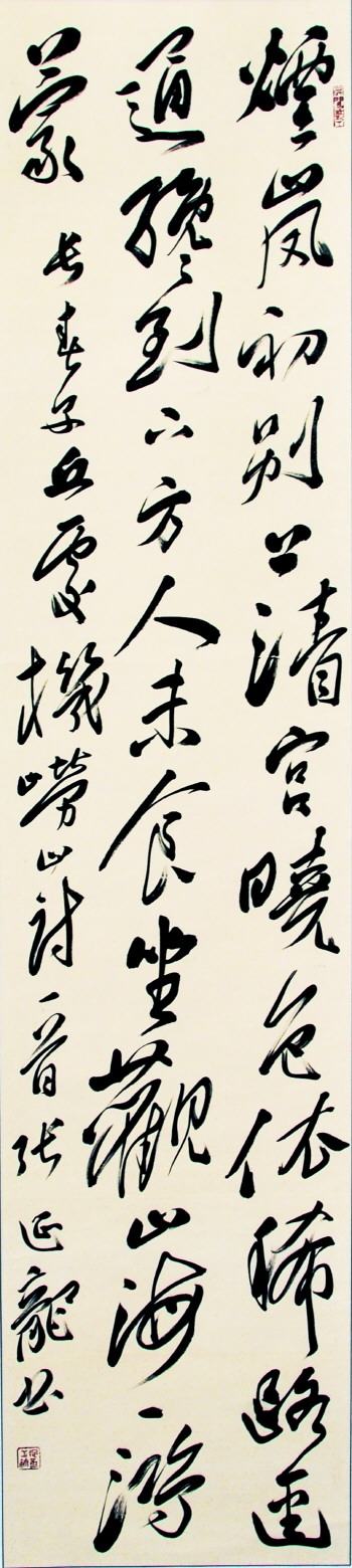 一曰性情。延龙先生性情舒朗豪放,任侠不羁,耿介而豁达。常以徐渭文长自比。徐渭者何人也?曰诗人、曰画家、曰书法家、曰军事家、曰戏曲家、曰民间文学家、曰美食家、曰酒徒、曰狂禅居士、曰青藤道士、曰旅行家、曰历史学家云云,延龙先生性情皆有与之相合处。延龙好美酒,而不耽于玉盘珍馐,得一二碟花生毛豆,约二三位同道好友,斟三四盏烈酒鲜啤,足以开怀痛饮、畅叙友情也。兴来每亲下厨烹调,出手皆美味。尝有姜、蒜同舂为泥之法,佐餐食之鲜于海味。延龙先生动辄饮醉,或于山野间呼号咆哮,或于酒肆中引吭高歌,或与文朋诗友唱和,或与武友行令猜拳,往往见景生情,睹物思人,常有出口成章,口吐莲花之快。延龙先生善诗而不囿于格律,拘于定法,游走于山水云雾之中,倘佯于书海典册之间,常有诗文冲口而出,直抒胸臆,不吐不快。外出游历数日,观庙宇山川,每得诗文数十,誊抄成册示与诗友,今已累数十册有余也。延龙先生虽一介书生却尚武崇侠,喜交游行武之人,每书武穆稼轩之词,则心潮澎湃,如书己出。曾言若有朝一日披挂上阵,则目眦尽裂与敌血拼到底,其性情与东北抗联无异也。“书为心画”,其书法艺术由其性情所致,呈排 开张、纵肆逸宕之气,则在情理之中也。