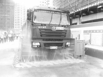 聊城一处工地正在清洗出入工地的渣土车。 本报记者 张召旭 摄
