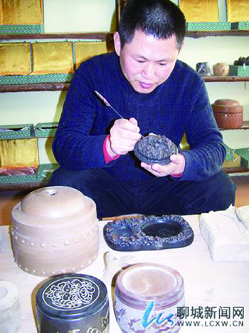“自幼喜爱画画,祖传澄浆玉泥枣木柴官窑,喜欢制作砚器,每年只做九方,人送外号:郭九砚。中国工艺美协会员。”在自己的博客中,东昌澄泥传承人郭太星这样介绍自己。
