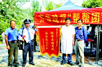 “郝大夫,上次帮帮团你治好了我的病,我给你送锦旗来了。”原来是家喻户晓的东阿县公安局义务宣传员陈金良,同为“帮帮团”爱心师傅,得知他身体抱恙,郝大夫当即义诊,陈金良为答谢义务治疗之恩,特制作了锦旗。