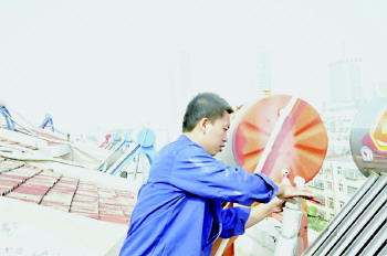 ③辛师傅在屋顶上修理太阳能。