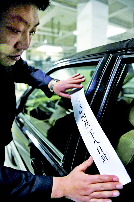 济南市各单位在假期封存公车。在槐荫区政府地下停车场内,一位公务人员给假期“休息”的公车贴上了封条。(资料片) 本报记者 王媛 摄