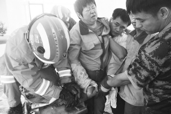 15日早上7时许,莱山区一食品企业的女工往绞肉机送肉时,右手不幸卡进绞肉机。消防官兵用切割机将绞肉机一侧割开一部分,利用液压扩张剪将绞肉机一点一点撑开。经过2个半小时的努力,成功将女工手指从绞肉机中取出。