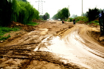 9月15日,经历雨水浇灌后的天河路变得泥泞不堪。附近居民表示由于小横河施工过程中天河路经大车碾轧,造成天河路路基受损。 本报记者 王小会 摄