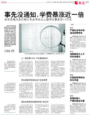 事先没有接到通知,在拿到录取通知书后,中国海洋大学MPACC专业的考生们才发现,学费由原来的4.5万元,突然上涨至8万,涨了近一倍。(本报9月11日A11版曾报道)。对于学费上涨的原因,海大招生办的负责人称是由于办学成本提高所致。