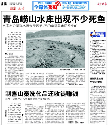 对于崂山水库北区出现大量死鱼,海润自来水集团相关负责人解释,环保部门工作人员现场调查,证实这些死鱼为市民放生的鱼。由于与原来的生活环境不同,这些放生鱼在水库中很快便死亡。
