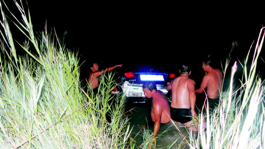 ◥村民和民警正在将落水的轿车拖上岸边。 本报通讯员 供图