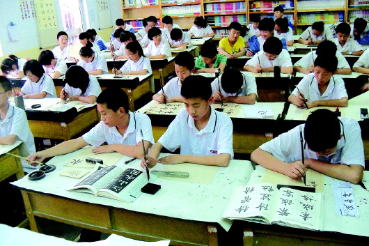 书法课是该校学校课程中的一个鲜明的亮点。全校各年级均开设硬笔书法或毛笔书法课,班级设立书法兴趣小组,学校成立“博雅书社”学生书法俱乐部,现有成员100多人,定期开展活动。开发了《书艺千秋》书法学校课程教材。书法课由穆德强、韩开平等老师授课。他们在提高学生写字审美情趣,形成书写能力方面做出了积极有效的努力。如穆德强老师在教学中引领学生摹写名家名帖,如楷书的庄重,点画的精到,结构的严谨,使学生强烈地感受到汉字之美。