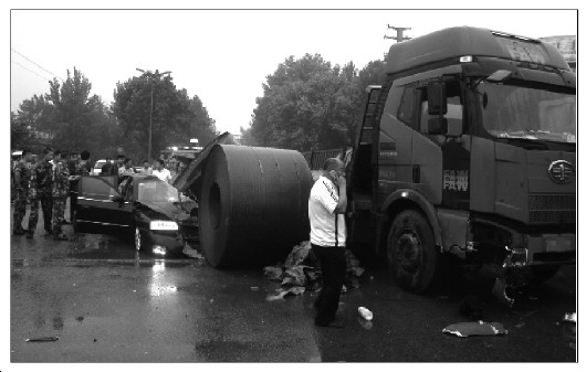 现场目击者介绍,一辆拉载钢卷的半挂车由北往东转弯时,车上未绑紧固定好的两个钢卷被甩出车厢,每个钢卷都重达20多吨,不慎将尾随在半挂车右后方正常行驶的小轿车砸中,小轿车司机被困车内不能动弹。