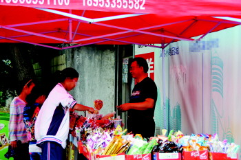 15日下午,在西六路一学校门外,学生们挤在小摊上购买零食。这些零食售价低廉,含有多种添加剂,生产厂家不明,存在一定的食品安全隐患。近日,淄博市将开展学校周边食品店、餐饮店、食品摊贩的专项检查,三无、假劣、过期的“五毛零食”将被依法查处。 本报记者 王鸿哲 摄影报道