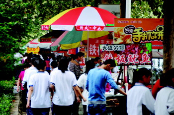 11时40分,放学铃声响起,学生们纷纷冲出校门,将各个小吃零食摊点围得水泄不通。