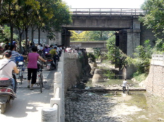 时间:2014年9月3日 自述:铁路桥下一侧的小路被行人车辆堵了个水泄不通,一个小伙子急于通过,干脆推着自行车下到干涸的河道里往前走。 点评:桥上太挤了,这哥们儿也是“挤”中生智。