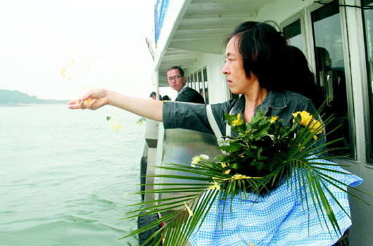 海葬现场,一位女士把亲属的骨灰撒向大海。 本报记者 陈乃彰 摄